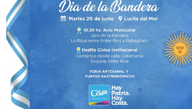 La Municipalidad de La Costa invita a la comunidad al acto en conmemoración del fallecimiento del General Manuel Belgrano, creador de la Bandera Nacional, nuestra máxima insignia patria.