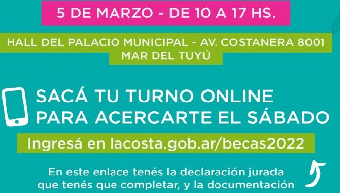 En lacosta.gob.ar/becas2022 se obtiene el turno correspondiente y se completa tanto el formulario con datos personales como la declaración jurada, para luego presentarse el sábado 5, fecha especialmente organizada para dar oportunidad de inscripción a aquellos estudiantes que se encuentren restringidos en disponibilidad horaria por motivos laborales.