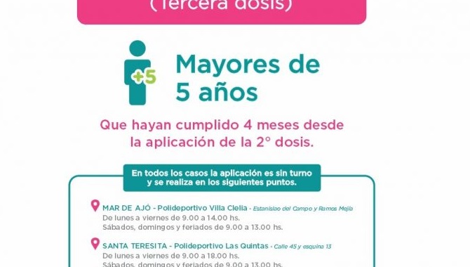 La Municipalidad de La Costa informa que ya se encuentra disponible la tercera dosis de la vacuna contra el Covid-19 para niños a partir de los 5 años de edad.
