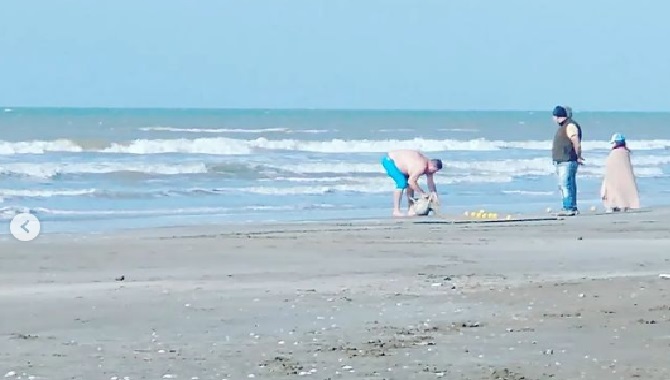Las imágenes fueron compartidas por distintas organizaciones como Ecos de Mar, Fundación Fauna Argentina y Activistas Animales del Partido de la Costa, para repudiar el accionar de un hombre que carga en sus hombros un delfín Franciscana que estaba sobre la arena del balneario situado a la altura de la calle 79 y que se lo lleva envuelto en una frazada.