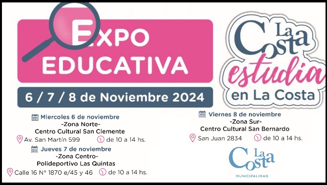La Municipalidad de La Costa invita a estudiantes secundarios y al público en general a participar de la Expo Educativa “La Costa estudia en La Costa”, que se realizará del 6 al 8 de noviembre. En esta edición, se presentará la variada oferta de carreras de nivel superior disponibles en el distrito para el ciclo lectivo 2025.
