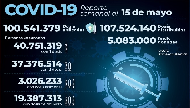 Según el Monitor Público de Vacunación, el total de dosis aplicadas asciende a 100.541.379, de los cuales 40.751.319 recibieron una dosis, 37.376.514 las dos, 3.026.233 una adicional y 19.387.313 una de refuerzo, mientras que las vacunas distribuidas a las jurisdicciones llegan a 107.524.140 y las donadas a 5.083.000.