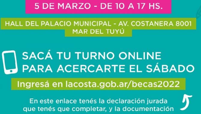 En lacosta.gob.ar/becas2022 se obtiene el turno correspondiente y se completa tanto el formulario con datos personales como la declaración jurada, para luego presentarse el sábado 5, fecha especialmente organizada para dar oportunidad de inscripción a aquellos estudiantes que se encuentren restringidos en disponibilidad horaria por motivos laborales.